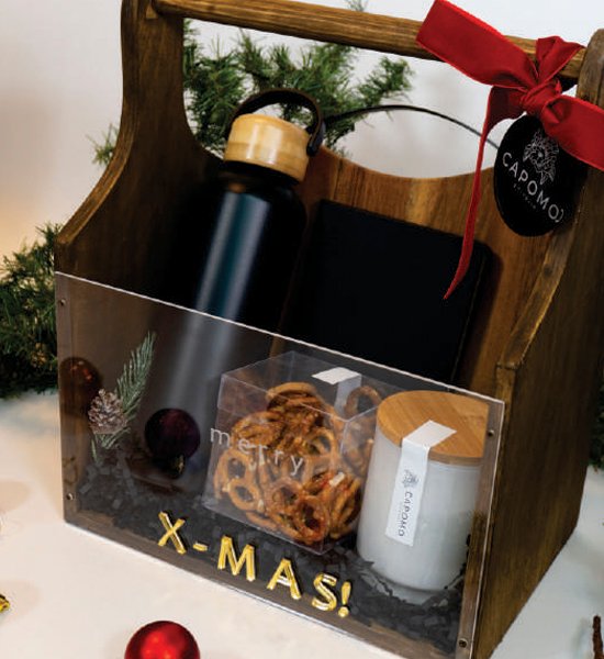• Tabla para picar de madera • Bottle water con logo o nombre • Agenda 2025 con logo o nombre • Vela aromática • Cajita con snack
