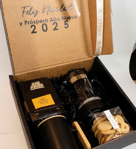 • 1 Bolsa de Café Azúcar Morena en grano • Prensa francesa para 2 tazas • Taza de cerámica 12oz o termo (personalizados) • Caja con snack